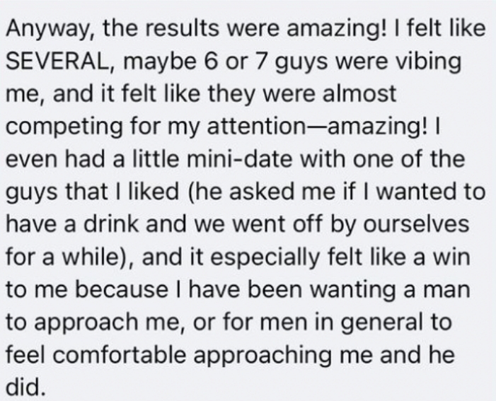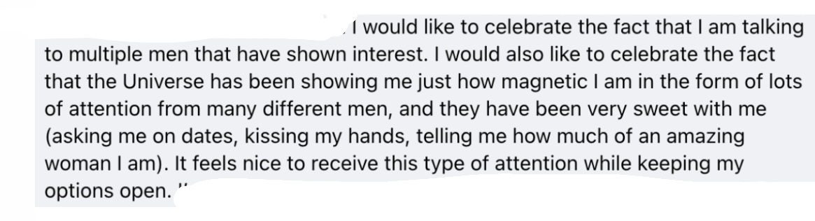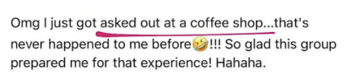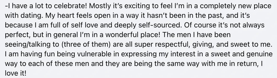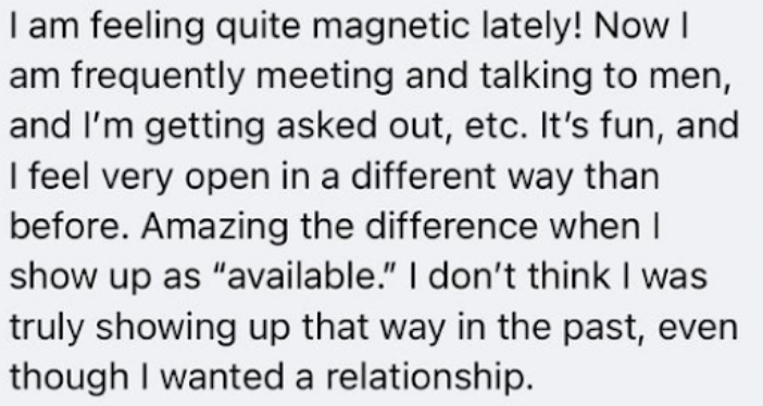 • Private Facebook for accountability, inspiration and support in between live sessions. We are here for when you need help crafting a text to a guy you’re dating, when you’re down and need a pep talk, or when you have things to celebrate! Our FB group is so warm, fun and supportive! (it’s not mandatory to participate in the FB group but its recommended!)