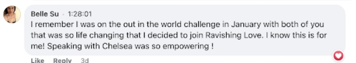 Chelsea and I want to offer you an invitation to our Feminine Way to Ravishing Love Program where we will guide you step-by-step into releasing old patterns, unleashing your authentic magnetism, and dating powerfully so you can attract the safe and loving relationship you naturally crave that is overflowing with passion, chemistry and romance!